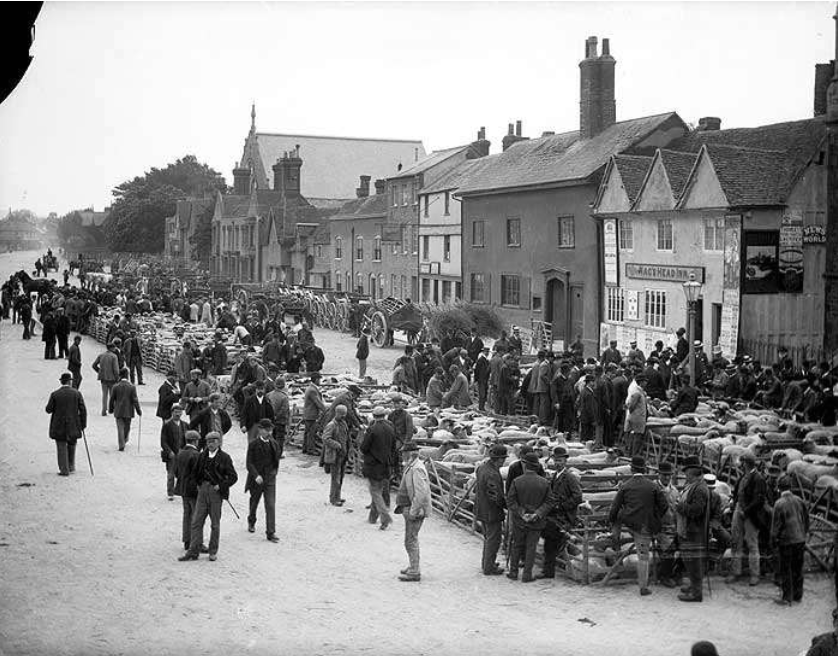 Thame Market in the High Street around 1900. Christchurch and the Nags Head can both be seen in the picture.