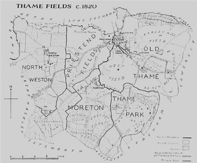 Before the 1823 Inclosure Act and 1826 Award, Thame had 2180 acres of arable land used for growing crops such as wheat, oats and beans. The open fields were large and divided into strips which were farmed communally.